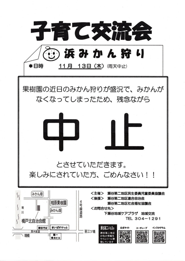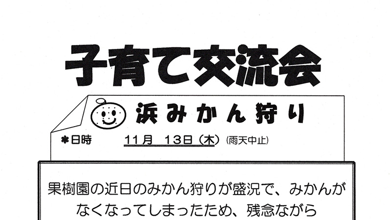 11月13日(木)に開催を予定していました、子育て交流会「みかん狩り」ですが、みかん不足のため中止となりました。