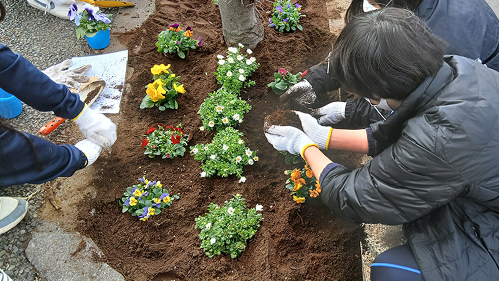 当日は厳しい寒さでしたが、生徒たちは元気よく、花の植え方や場所、道具の確認を行い、12グループに分かれ活動場所に移動しました。生徒たちは、花植え場所のゴミを取り、スコップで耕し、肥料をまき、シャベルで穴を掘り、ビオラやパンジーなど288株を植栽しました。