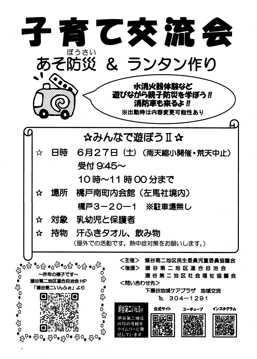 瀬谷第二地区民生委員児童委員協議会(細川正行会長)では、子育て中の保護者の方とお子さまを対象に交流会を開催します。