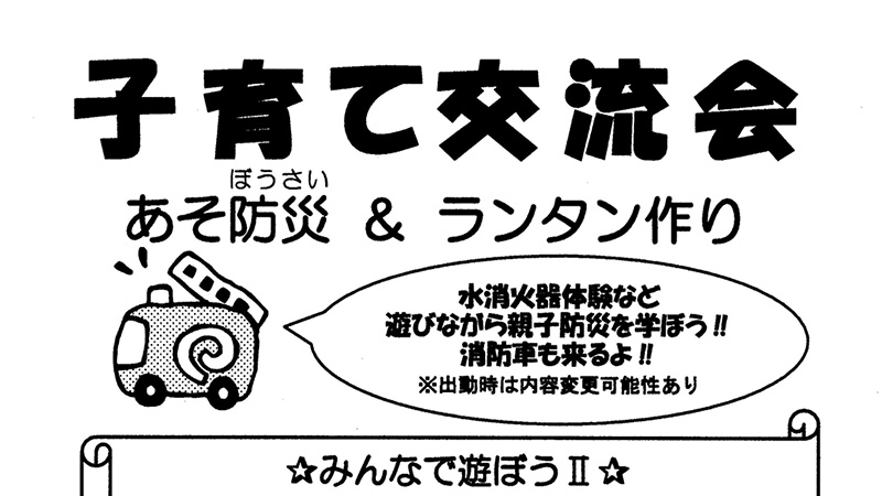 今回は、みんなで遊ぼうⅡ「あそ防災 & ランタン作り」を行います。お気軽にご参加ください。